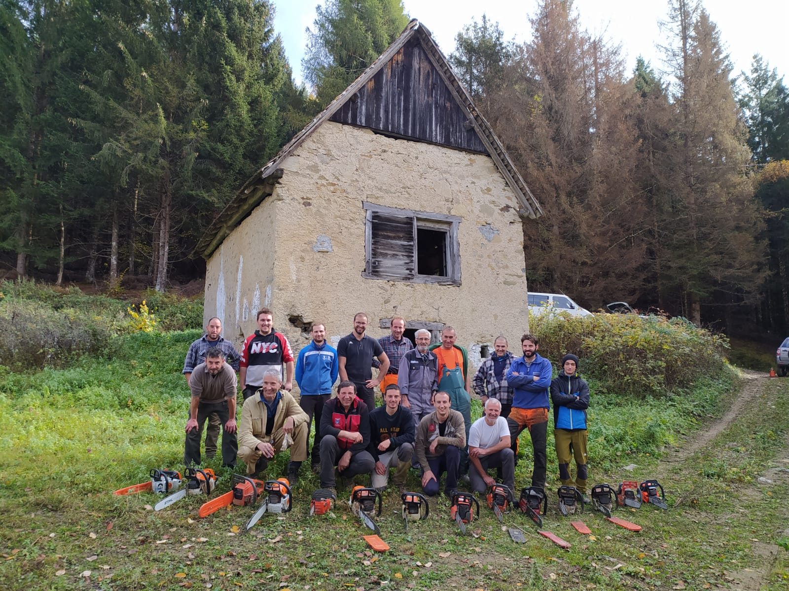 Nelle foto i rappresentanti della Comunità di Clavais, Mattia Primus, Francesco Marin, Emil Not e Nicola Puschiasis, al “Summit delle Bandiere verdi di Legambiente”, celebrato il 3 maggio in Piemonte e frazionisti di Clavais al lavoro nei Boschi collettivi