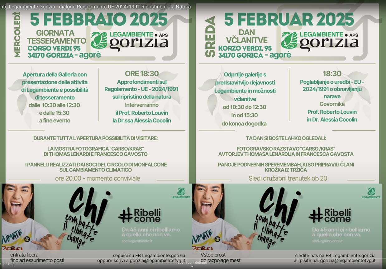 La dottoressa Alessia Cocolin, dottoressa in diplomazia e cooperazione internazionale, introdotta dal professore di diritto comparato Roberto Louvin dell’Università di Trieste, sede di Gorizia, in occasione della “Giornata del Tesseramento” di Legambiente Gorizia APS, ha illustrato in modo molto chiaro e preciso il Regolamento UE – 2024/1991 sul Ripristino della Natura, recentemente entrato in vigore. Si tratta di un nuovo strumento legislativo, che dovrebbe costituire una svolta importante nella politica ambientale di tutti e 27 i Paesi Membri dell’Unione Europea.