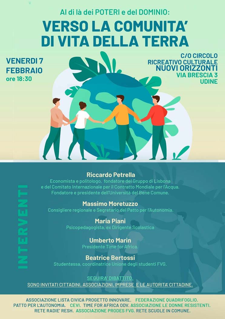 Dobbiamo costruire una nuova architettura sociale globale (politica, economica, finanziaria, sociale, tecno-scientifica…), una comunità di vita planetaria, articolata su una vasta rete cooperativa di federazioni di nuove comunità umane di vita da inventare e da sperimentare all’insegna dei principi dell’uguaglianza , della giustizia e dell’autonomia condivisa, cosi come del rispetto dell’integrità delle altre comunità e della comunità planetaria.