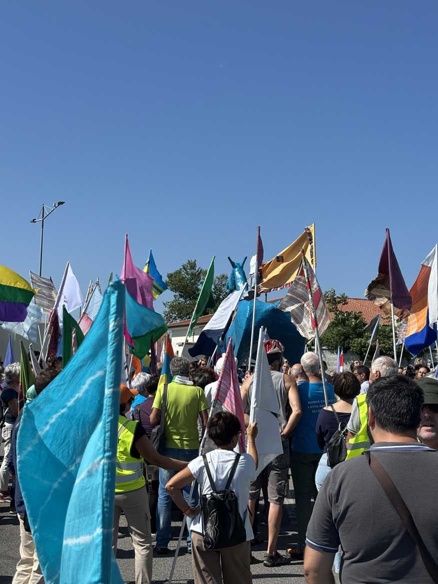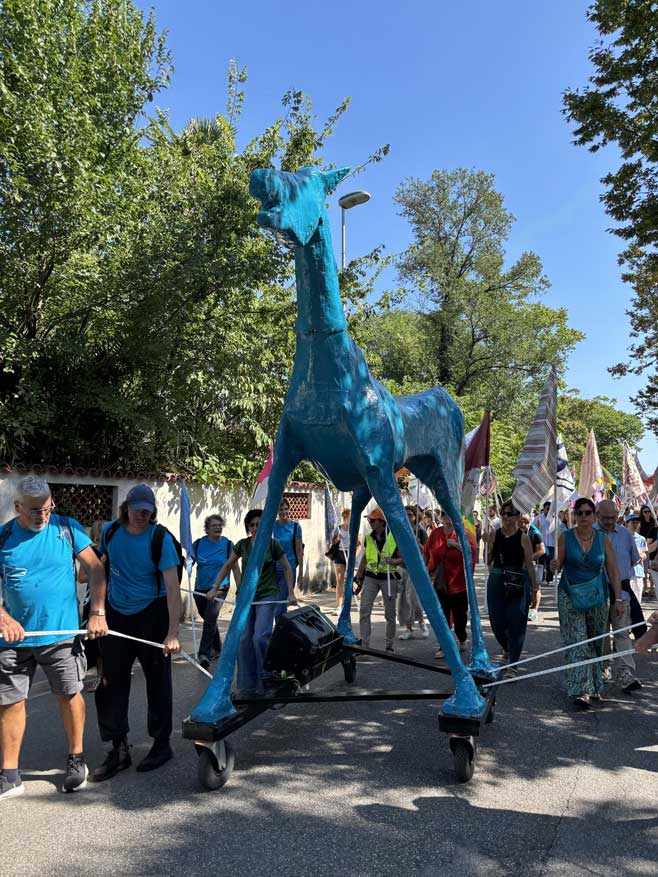 Fin dal mattino, la piazza di Gradisca d’Isonzo ha iniziato a riempirsi di gente: giovani, famiglie, associazioni, attivisti, operatori sociali, sacerdoti, cittadini comuni. Chi portava uno striscione, chi una bandiera, chi semplicemente la propria presenza. L’arrivo di Marco Cavallo ha attirato subito gli sguardi: imponente e fragile, dipinto di un azzurro acceso, sembrava guidare un corteo che non era solo una manifestazione ma un gesto collettivo di coscienza. A unire i partecipanti non c’era un’appartenenza politica, ma la consapevolezza che i CPR rappresentano un buco nero della democrazia, luoghi dove la dignità viene sospesa.