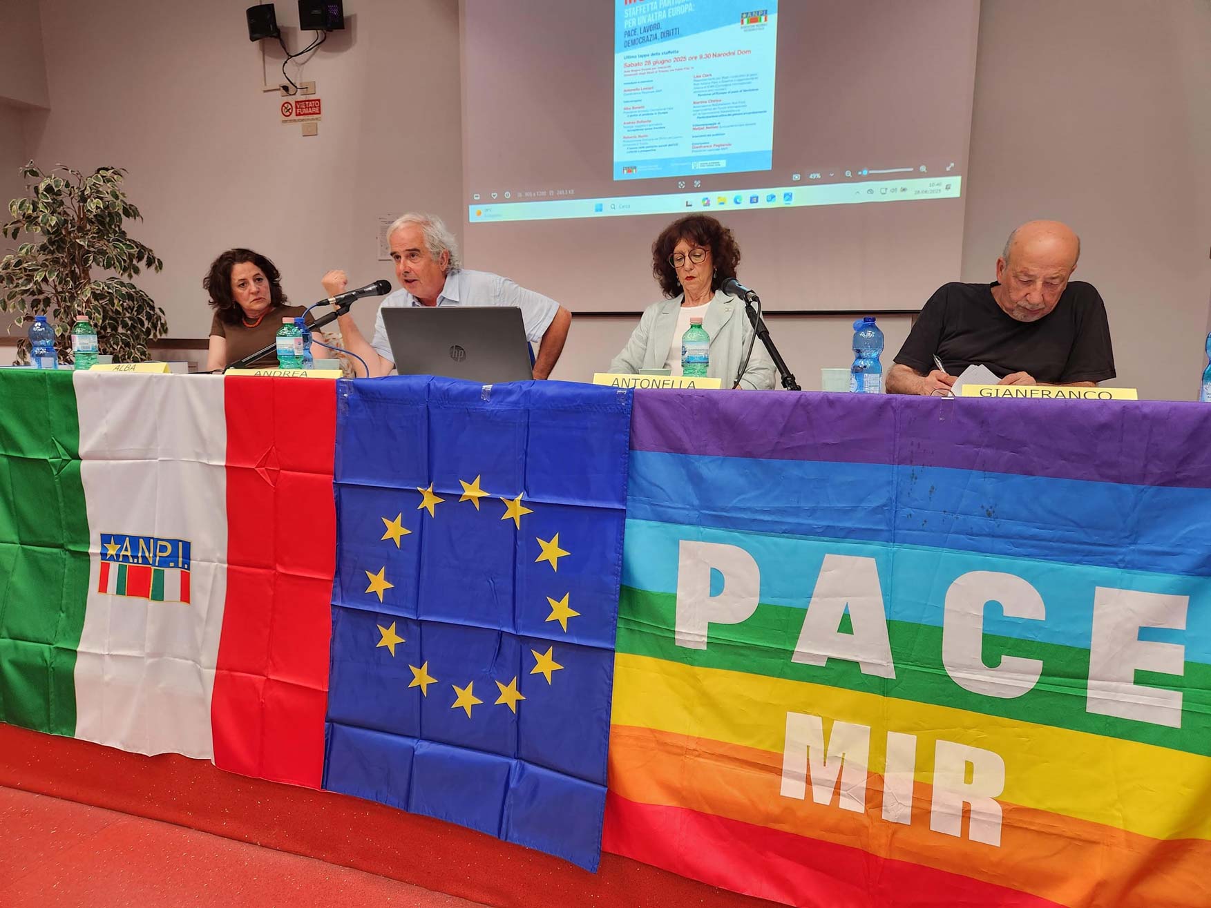 Antonella Lestani, coordinatrice regionale ANPI, ha introdotto i lavori, sottolineando l’urgenza di affrontare le molteplici crisi che caratterizzano il nostro tempo. E sottolineando come il Narodni Dom di Trieste, che ha ospitato questa ultima tappa della “Staffetta Partigiana per un’Altra Europa: Pace, Lavoro, Democrazia, Diritti”, sia un luogo simbolo di memoria e resilienza.